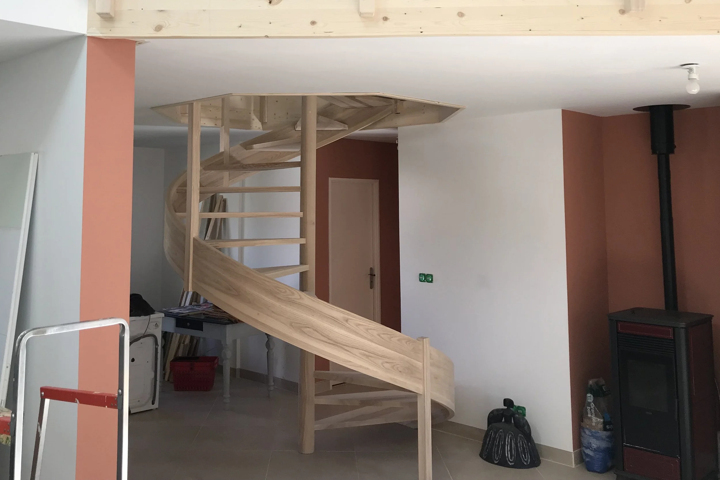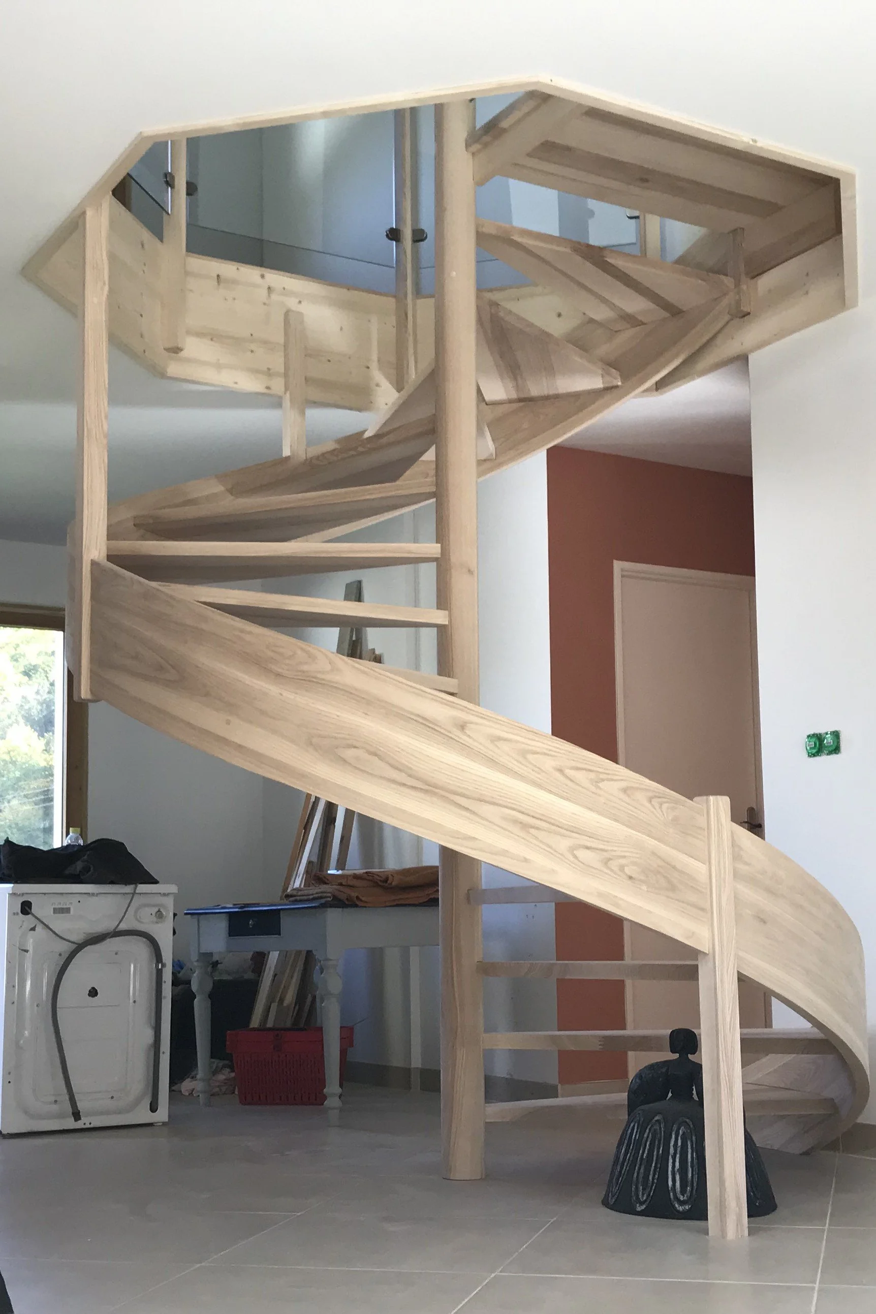 Escalier hélicoïdal, limons extérieurs cintrés et poteau central.